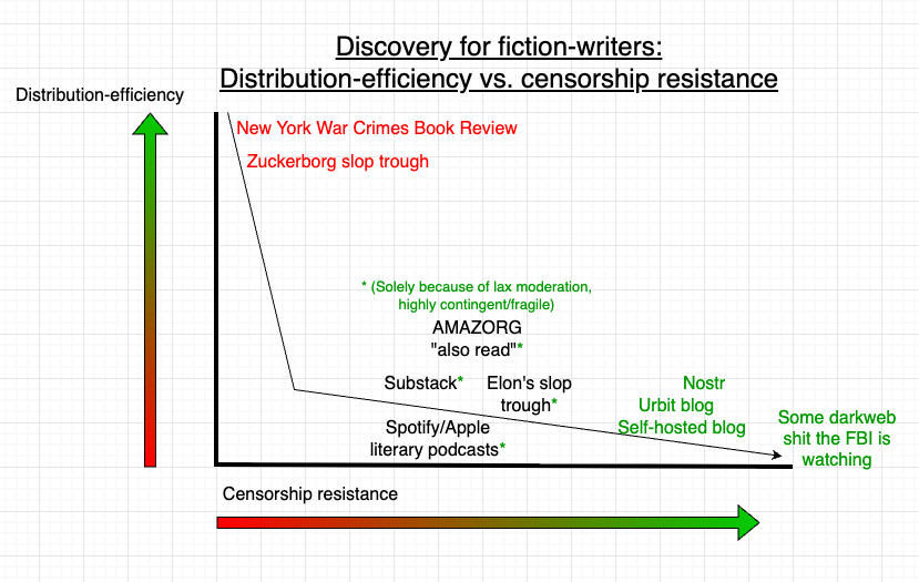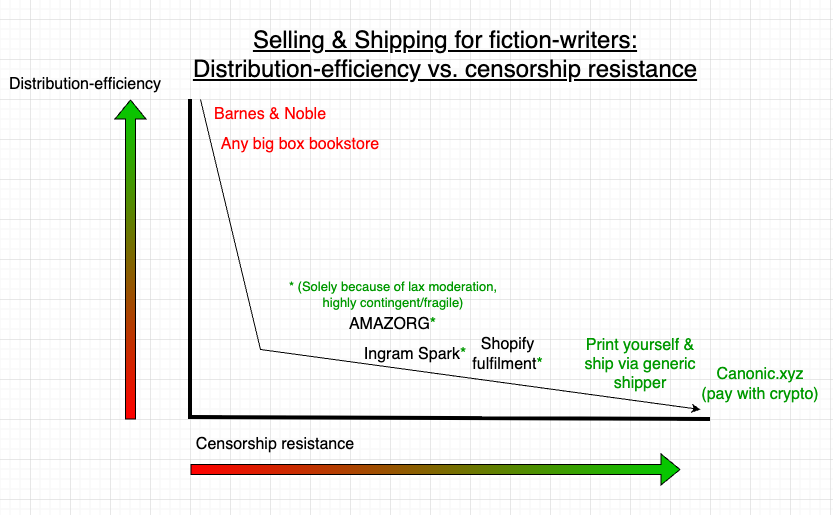 The thing that I want to impart here is a very simple framing: every novelist must choose what constitutes an acceptable tradeoff between censorship-resistance and distribution.