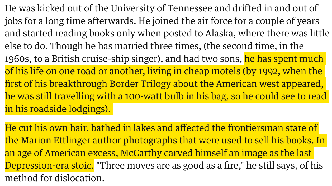 Yes, McCarthy eventually made it and found his deserved success, but that does not erase the years of living in cheap motels and being so poor that you need to read books with a light bulb stored in your bag.